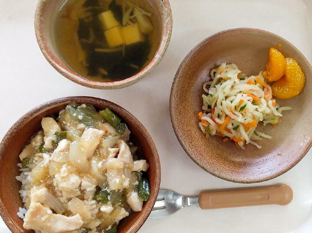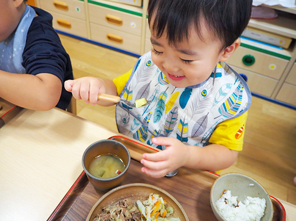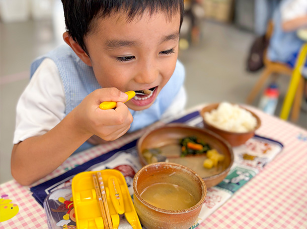 • 昼食は栄養士が旬の食材を取り入れ、栄養のバランスのとれた献立を作成し、自園の給食室で作ったものを提供しています。