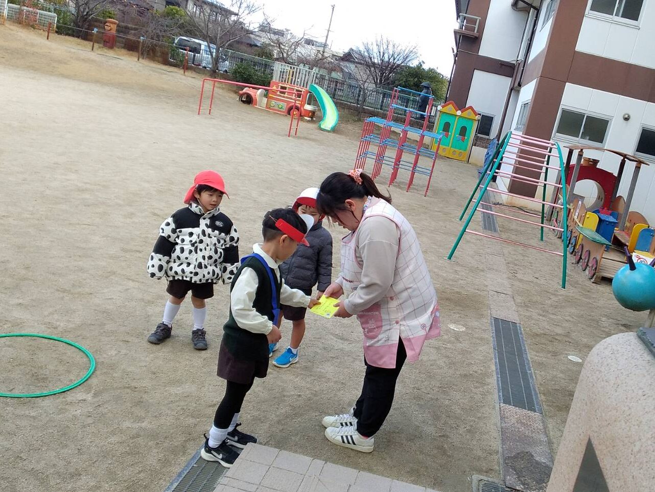 年長組の郵便屋さんが皆に年賀状を配ってくれる姿も見られました。