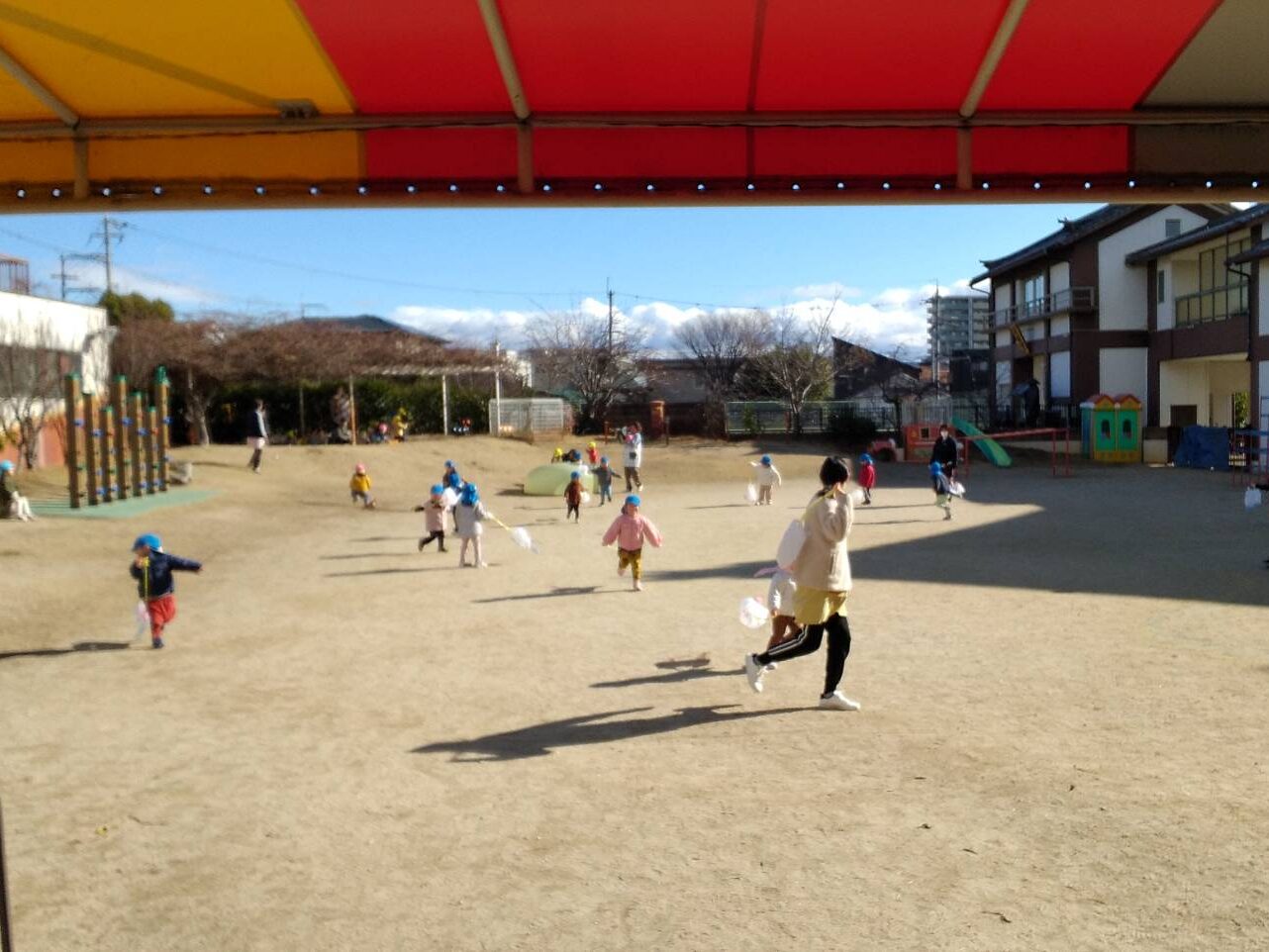 園庭では乳児さんが「凧あげ」を楽しんでいます。