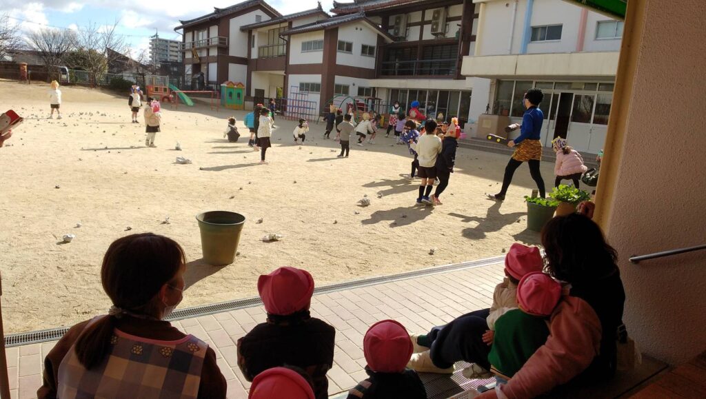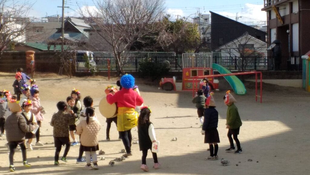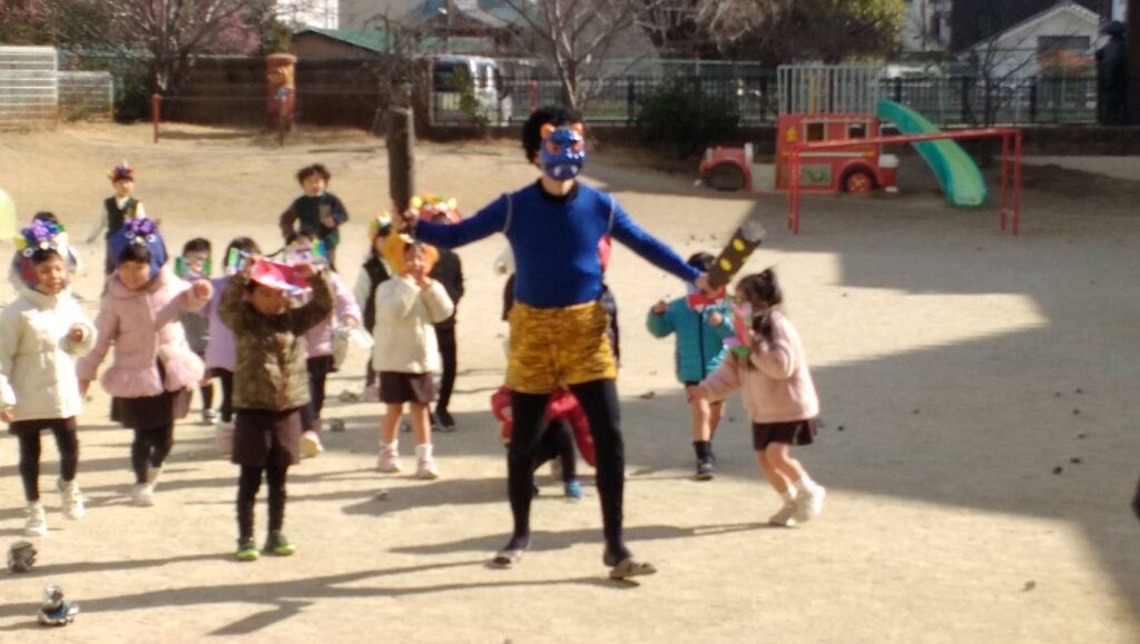 園庭を暴れまわる鬼を皆でやっつけて追い払いました☆