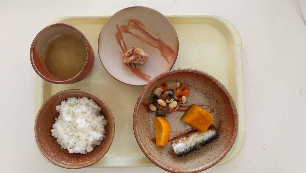 お豆と野菜の煮物といわしのみぞれ煮が出ました。